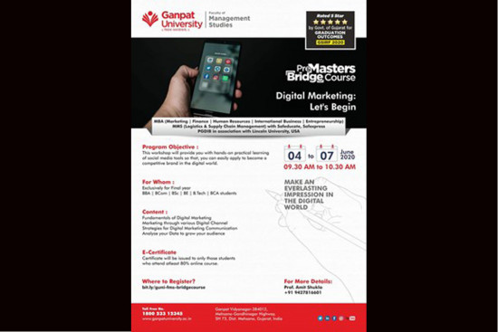 Ganpat University- Faculty of Management Studies offers a learning platform through enrolling yourself in Pre Master Bridge Course- Digital Marketing: Let's Begin that will help to create your influential presence in the virtual world. This workshop will provide you with hands-on practical learning of social media tools helping you to become a digital marketer.